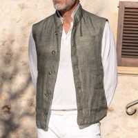 Sku:Mens Casual Stand Collar Multi-Pocket Linen Single Breasted Ves