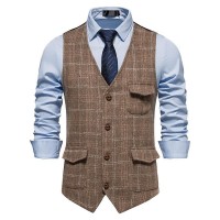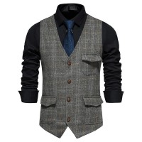 Sku:Mens Vintage Check Breast Pocket Collarless Vest 51861612Y