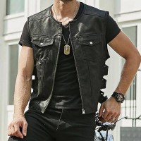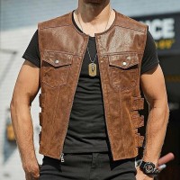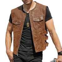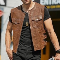 Sku:Mens Vintage Solid Color Chest Pocket Collarless Leather Vest 8